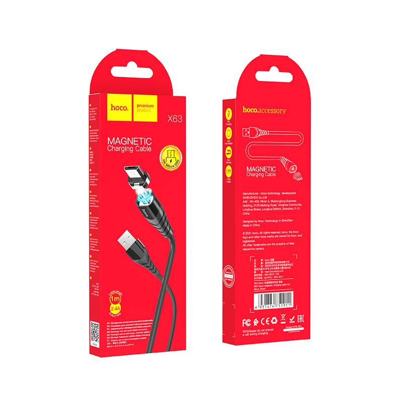 Кабель USB HOCO X63 Racer, USB - MicroUSB, 2.4А, 1 м, черный, с магнитным выходом