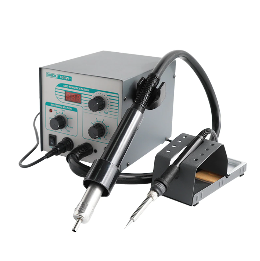 Паяльно-ремонтный комплекс QUICK 706W+ объединяет в одном приборе традиционную паяльную станцию для контактной пайки и термовоздушную паяльную станцию для компонентов SMD. Паяльно-ремонтный комплекс QUICK 706W+ имеет антистатическое исполнение (ESD), превосходно подходит как для монтажа, так и для демонтажа большинства компонентов. Оба модуля имеют индивидуальные выключатели питания и могут быть использованы как самостоятельно, так и совместно.