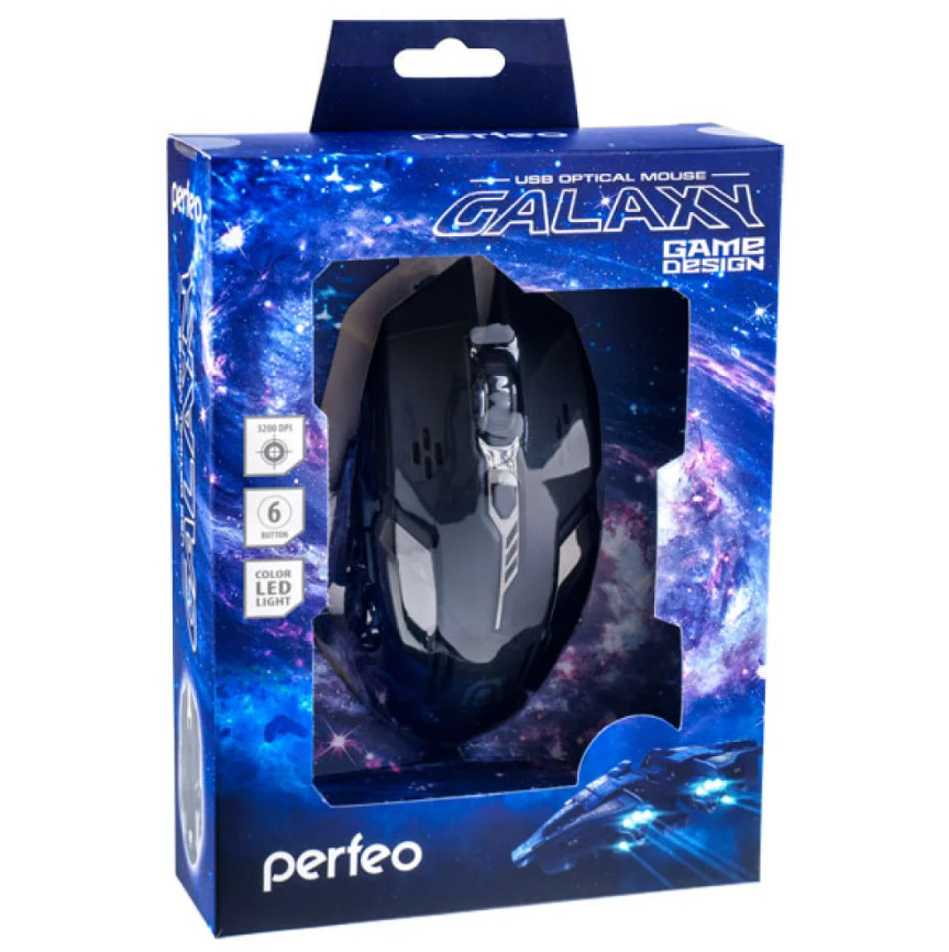 Мышь компьютерная проводная Perfeo (PF_5017) GALAXY GAME DESIGN с подсветкой/ 6 цветов/ 6 кнопок/ 1.8м/ 1200-3200 DPI черная