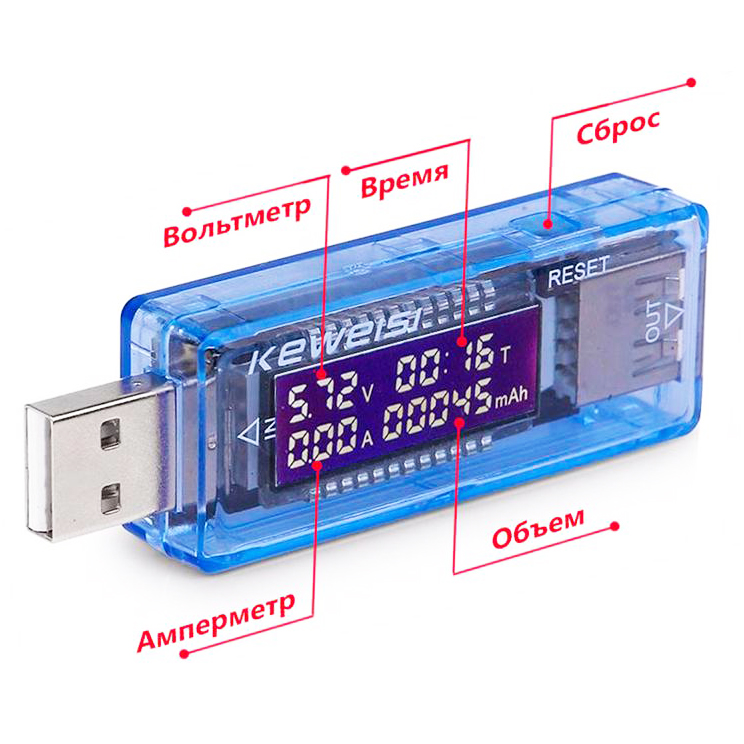 Память: энергонезависимая, сохранение последнего показания, долгим зажатием кнопки «reset» обнуляются параметры емкости и времени заряда
