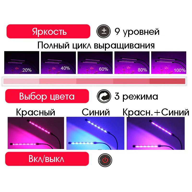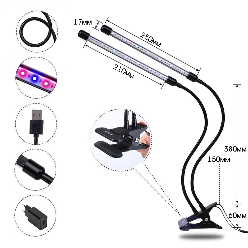 Комплектация: фитолампа, блок питания USB 5В/2А, инструкция на Русском