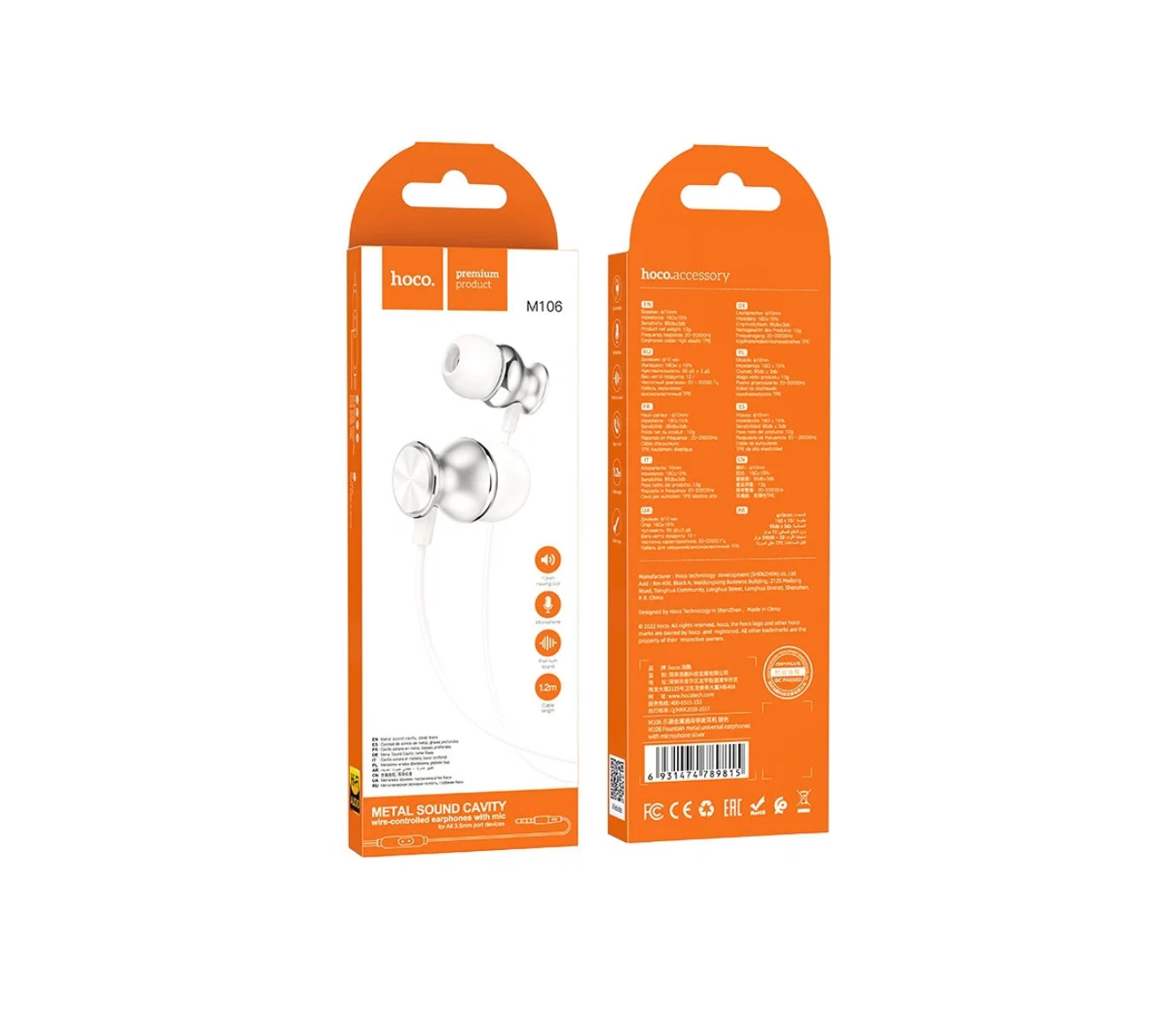 Наушники M106, Fountain metal universal earphones, HOCO, вакуумные, серебристые