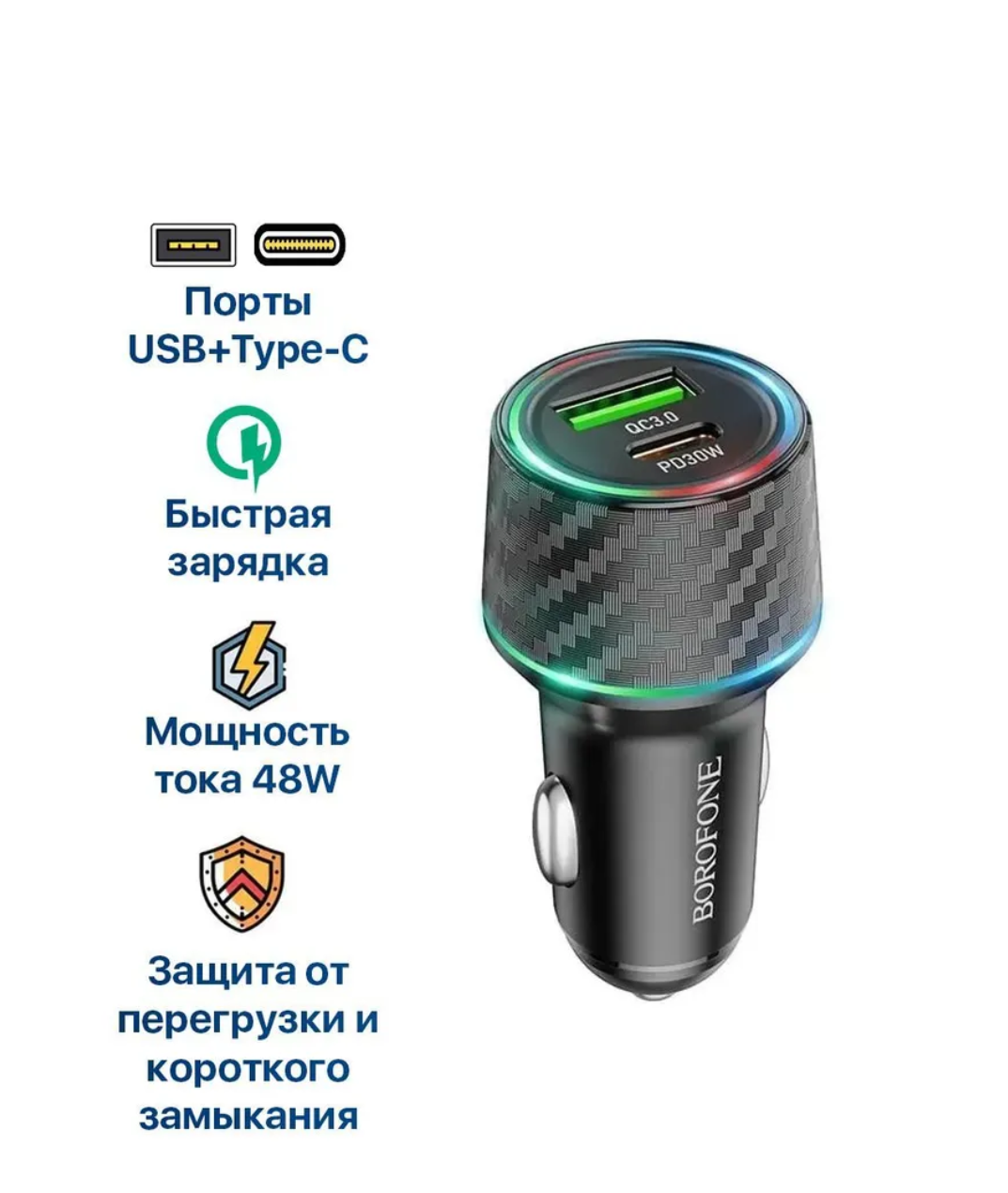 Автомобильный адаптер BOROFONE BZ21 (USB+Type-C) Brilliant 48W PD30W+QC3.0, черный