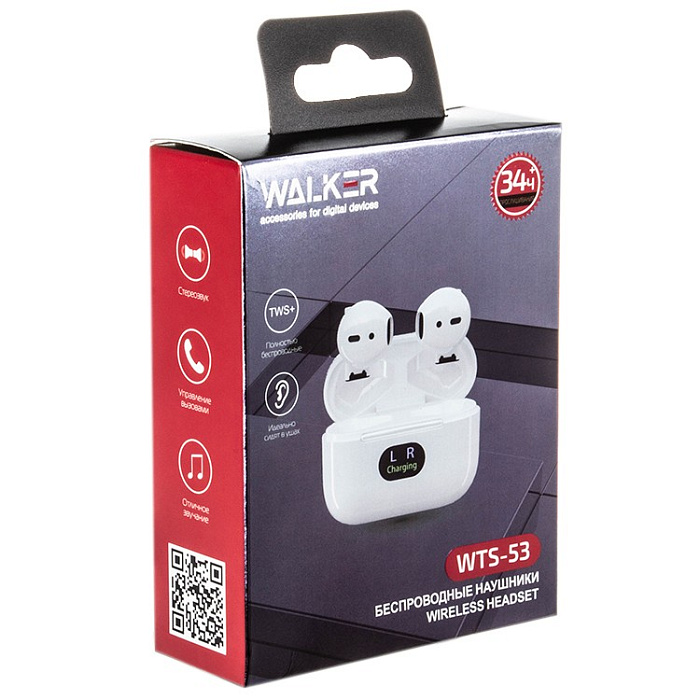 Беспроводные наушники WALKER WTS-53, Bluetooth, сенс. управление, независ. работа наушников, граф. индикатор заряд, белые