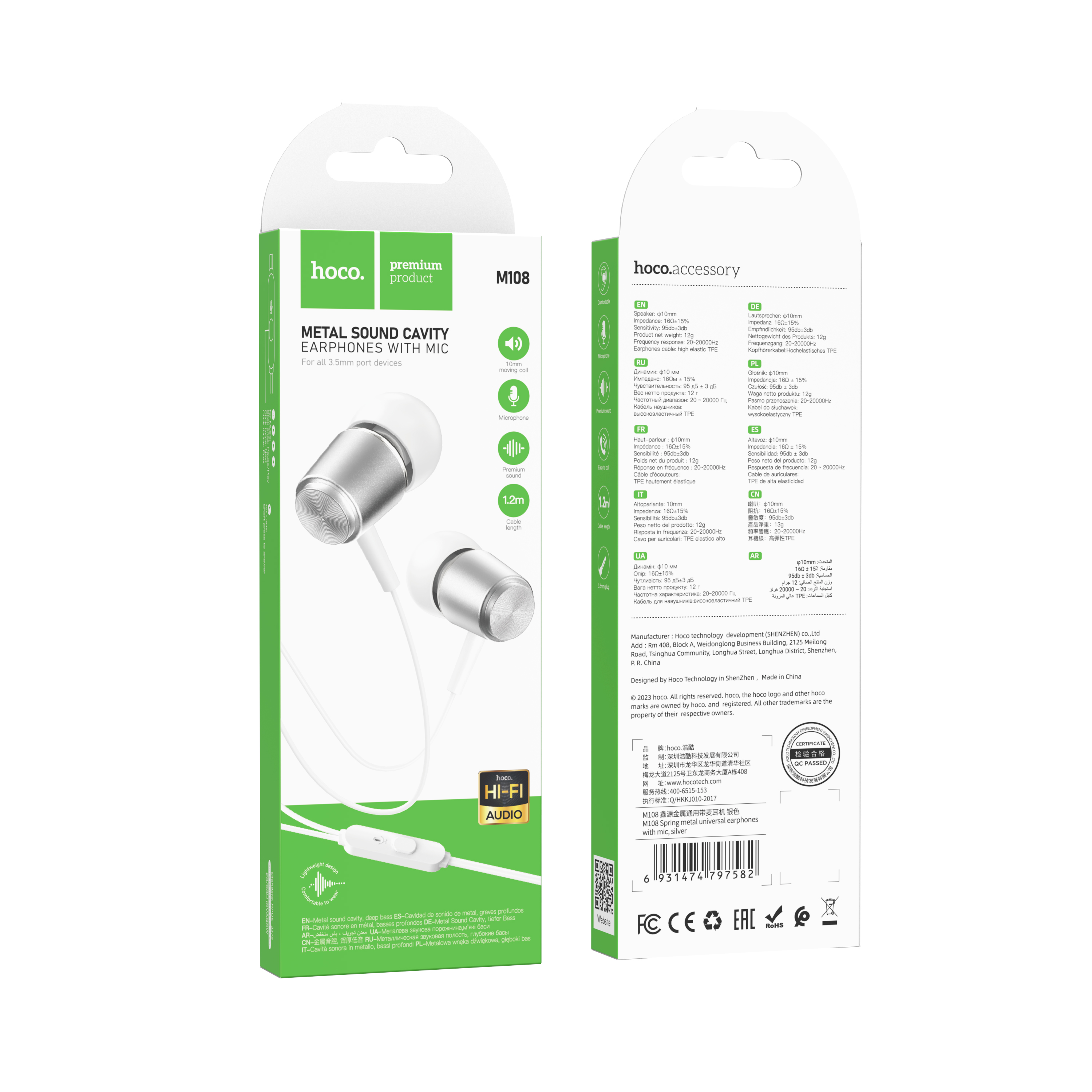 Наушники HOCO M108 Spring metal universal earphones with microphone с микрофоном, серебристые