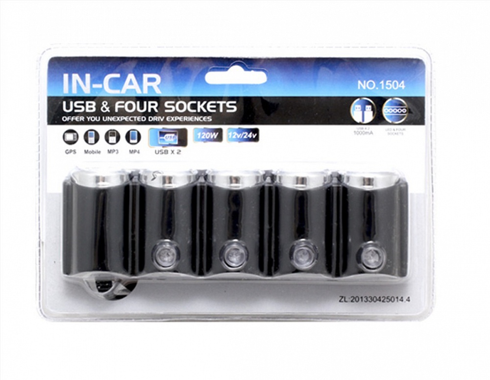 Разветвитель розетки автоприкуривателя OLESSON 1504 (4 гнезда, 2USB) на проводе, черный