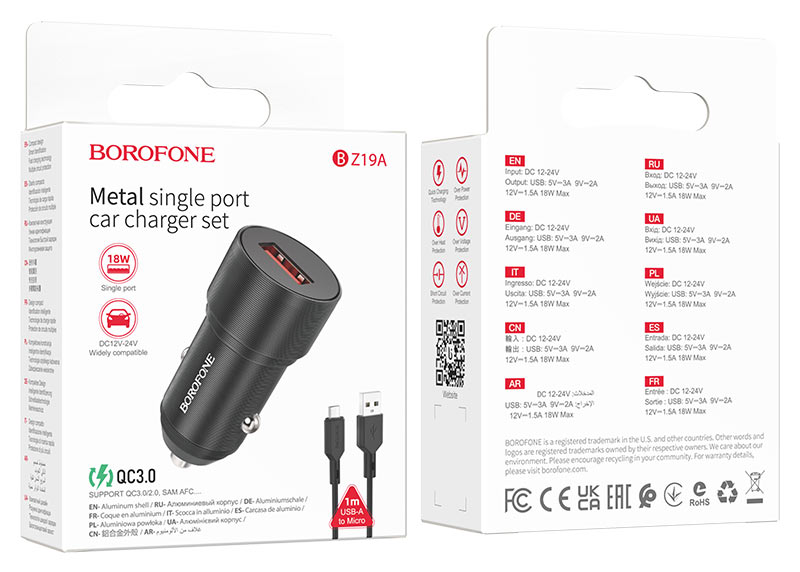 Автомобильный адаптер BOROFONE BZ19A Wisdom single port QC3.0 car charger set + кабельType-C, черный