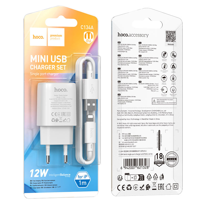 Сетевое зарядное устройство Hoco C134A предлагает надежное и эффективное решение. Этот блок для зарядки оснащен выходом USB, который обеспечивает максимальный ток до 2.4 A, что позволяет оперативно восполнить восполнения энергии вашего гаджета.