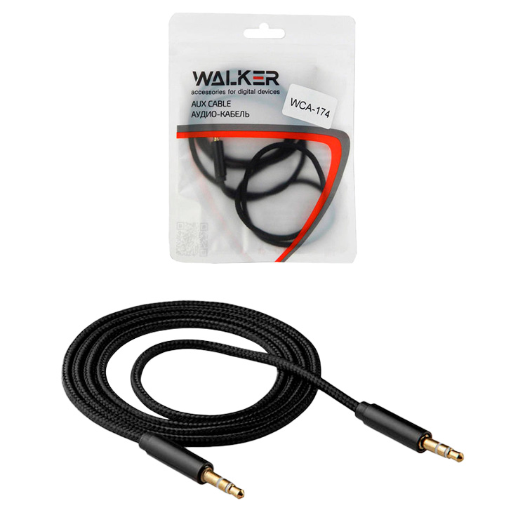 Аудио-кабель AUX Jack 3.5(m) - Jack 3.5(m) WALKER A-A WCA-174 в тканевой оплетке, предназначен для подключения телефона, планшета, наушников и других медиа устройств с соответствующим входом.