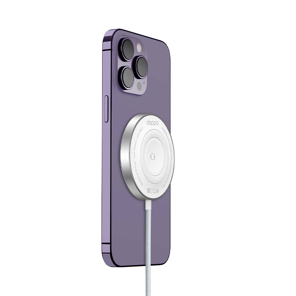 Стильное и компактное беспроводное зарядное устройство MagSafe Charger 2 в 1 от Deppa подходит для трёх типов устройств: iPhone, Apple Watch и Airpods.