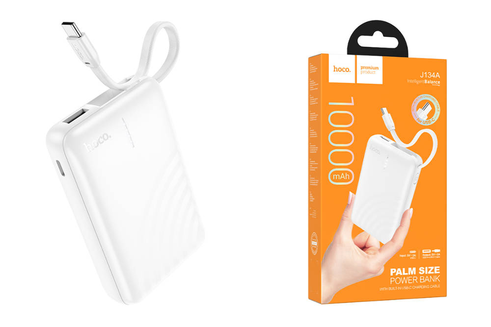 Внешний аккумулятор Power Bank 10000 mAh HOCO J134A, с кабелем USB-C, белый