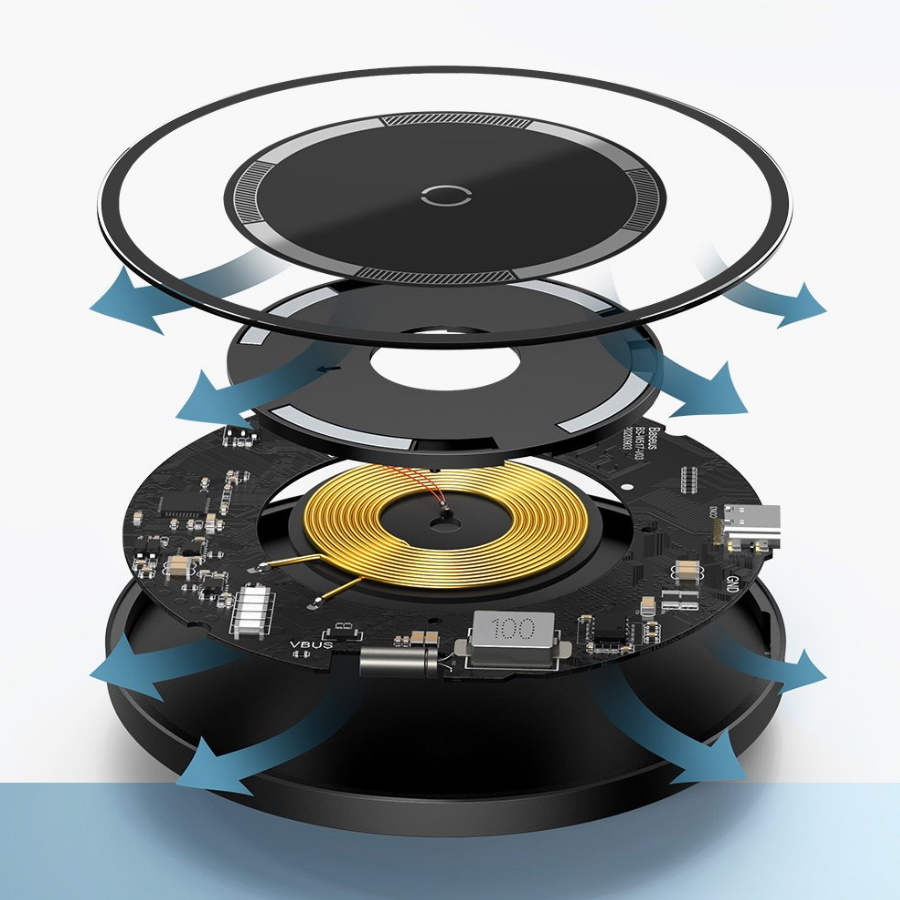 Мощное беспроводное зарядное устройство Baseus Simple Magnetic Wireless Charger 15w позволяет быстро зарядить батарею вашего смартфона без подключения кабеля. С ее помощью можно заряжать практически любые устройства, поддерживающие Qi технологию. Эффективность преобразования энергии достигает 75%, что позволяет ей наравне соперничать с проводными аналогами. Во время зарядки разъем остается свободным, поэтому можно подключить наушники и прослушивать музыку, отвечать на звонки и уведомления. Устройство имеет надежную систему защиты от перегрева, перегрузок и скачков напряжения, делая зарядку гаджетов не только быстрой, но и безопасной. Благодаря индикатору на корпусе устройства вы легко узнаете о том, что процесс зарядки идет нормально. Силиконовые накладки снизу предотвращают скольжение по столу, обеспечивают надежную фиксацию, а встроенный магнит предотвращает смещение и скольжение телефона по поверхности зарядного устр